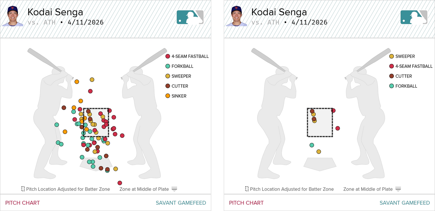 As Carlos Mendoza said in his post-game presser, the core of Senga’s game lies in the fastball — if that’s not working, the rest of his arsenal probably isn’t going to look great that day either. If Senga’s fastball isn't getting whiffs, either because he’s not placing it effectively or because hitters are just seeing it well out of his hand, that immediately limits the effectiveness of the rest of his mix. His fastball has a very straight shape, so if he’s only locating it for strikes about 50% of the time, it’s much easier for hitters to sit and wait for something else in the zone. When he’s having trouble locating both his fastball and forkball, anything else that’s left in the zone just looks that much more hittable.