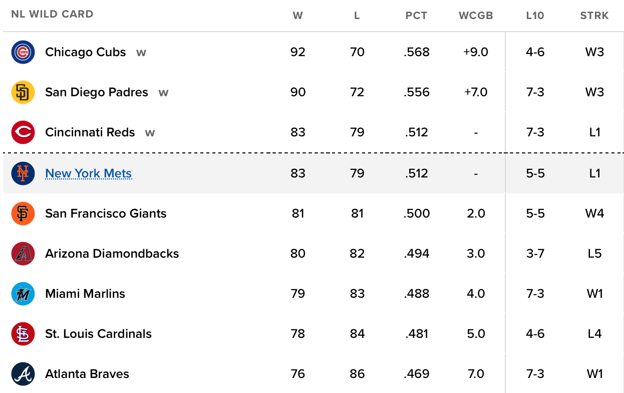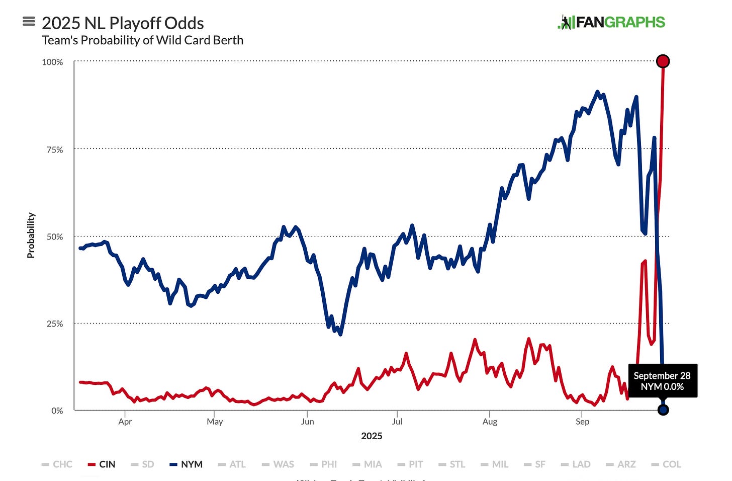As such, with their loss to the Marlins, the Mets were eliminated from playoff contention, regardless of what happened with the Reds, who won the tiebreaker over the Mets, thus winning the third wild card.
