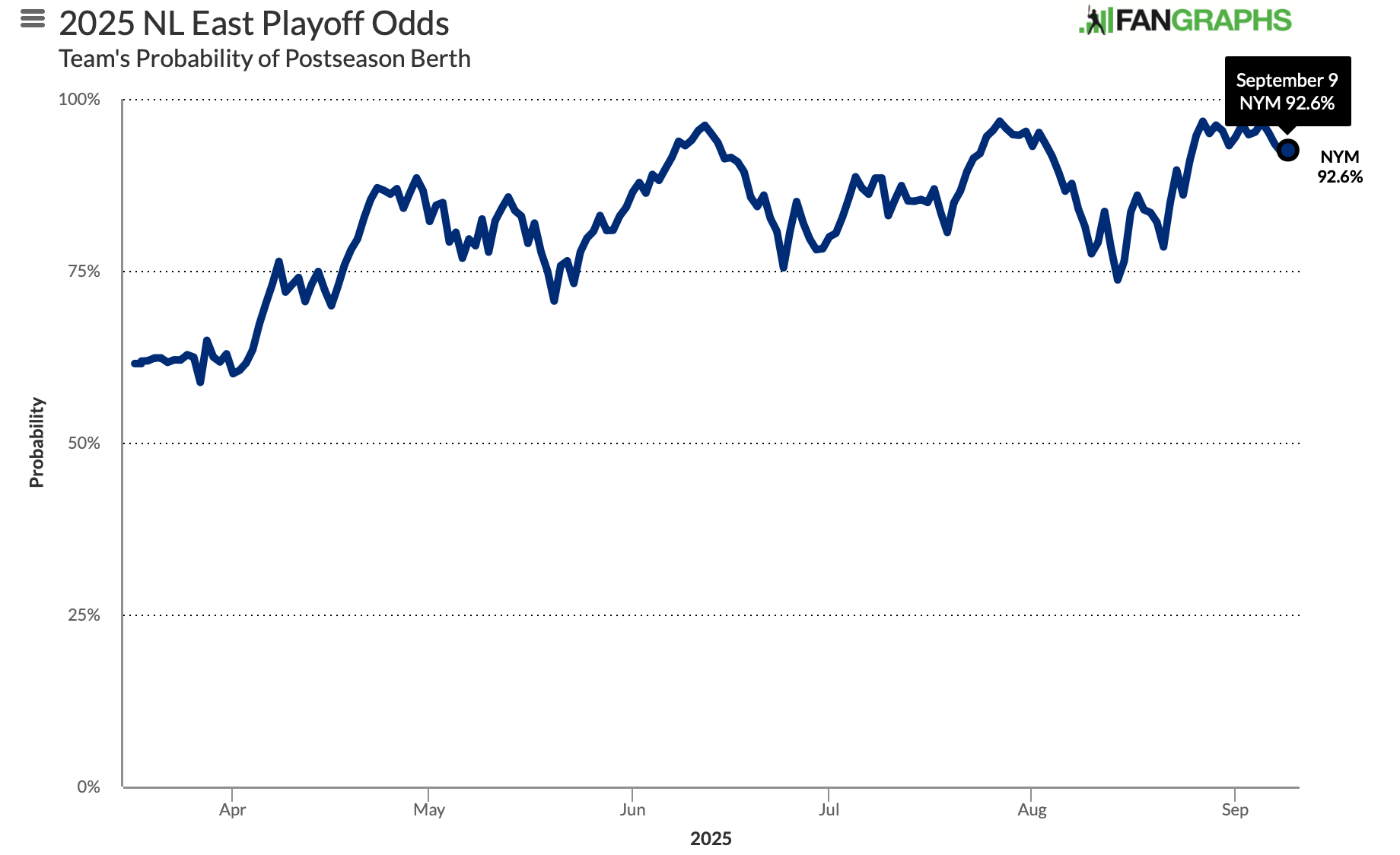 Per Fangraphs, the Mets have a 92.6% chance to reach the postseason.