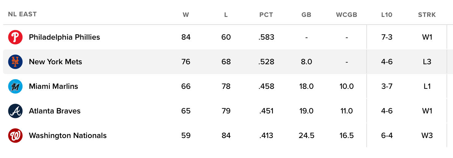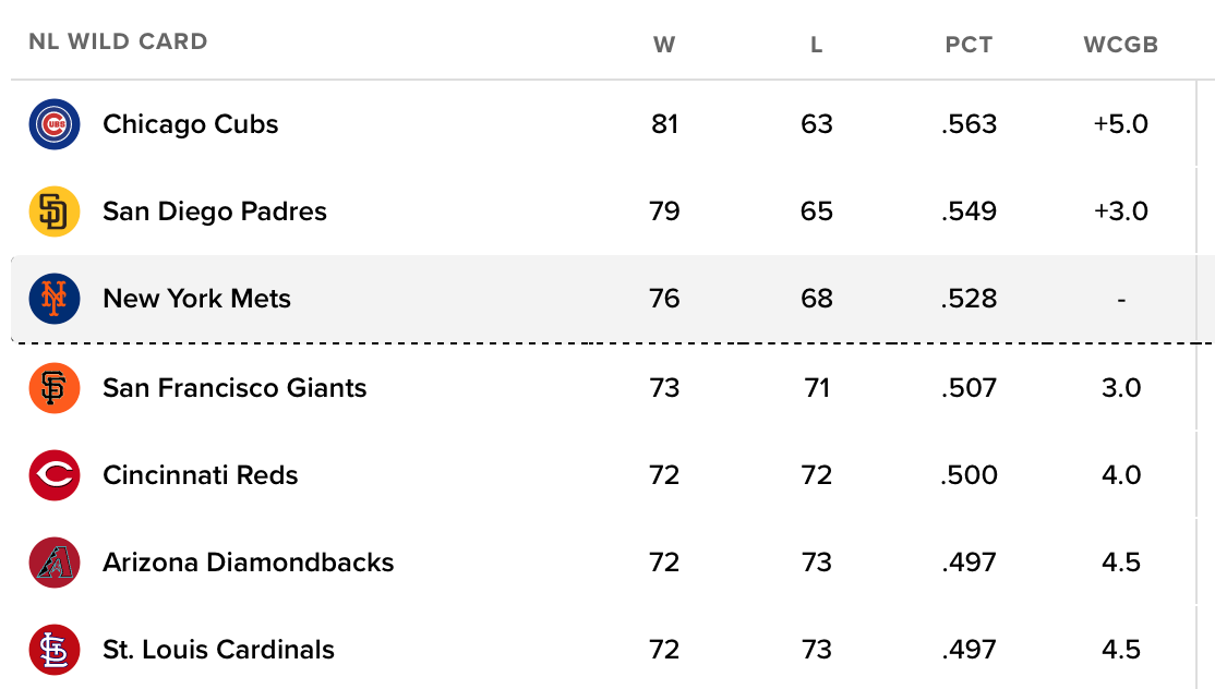 Meanwhile, many of the Wild Card contenders are playing each other this week. The Giants beat the Diamondbacks, the Reds lost to the Padres, and the Cardinals lost to the Mariners. As such, the Mets cushion in the Wild Card standings shrunk to three games over the Giants: