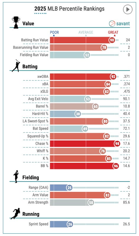 The outfielder was excellent for the Cubs this past season, as his 136 wRC+ ranked 16th best in all of baseball and fifth among right fielders. Tucker’s issues continue to be his health – as he only played 136 games this past season after missing time in September due to a calf strain. He was about league average defensively in 2025, although he has historically been a plus-defending outfielder with a strong arm. He is far less versatile than Bellinger, who can play all three outfield positions and first base, whereas Tucker is really only a corner outfielder.
