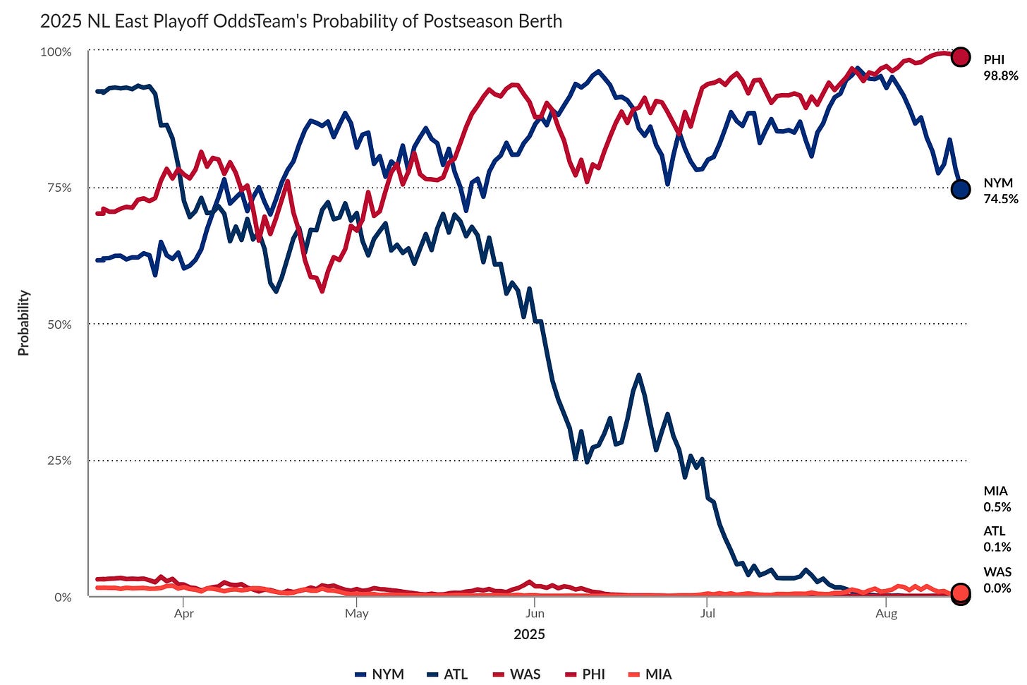 Per FanGraphs, the Mets playoff odds sank to 74.5% which is down from 78.7%.