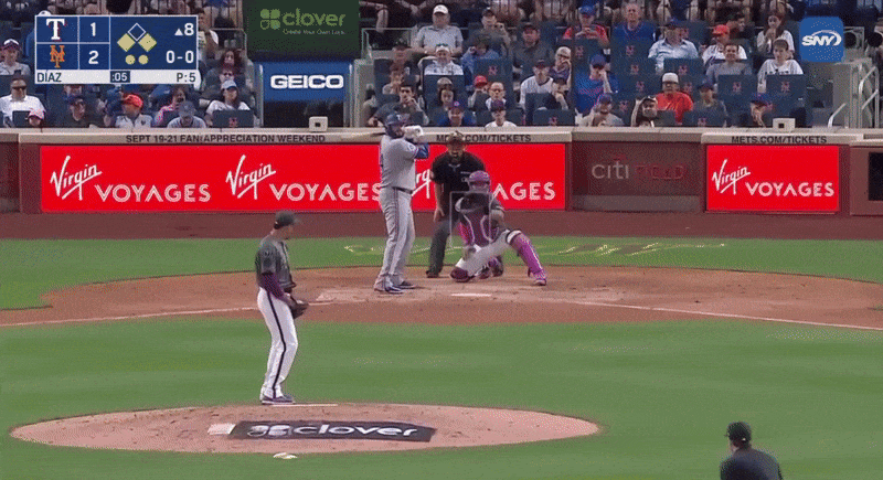 Upon entering in relief of Tyler Rogers to stop some late-game bleeding incurred by Francisco Alvarez’s catcher's interference, Edwin Diaz immediately threw a wild pitch past Alvarez, moving the tying run in Wyatt Langford to third. Then, after surrendering a walk to Josh Jung and with Rowdy Tellez at the dish, Diaz did this: