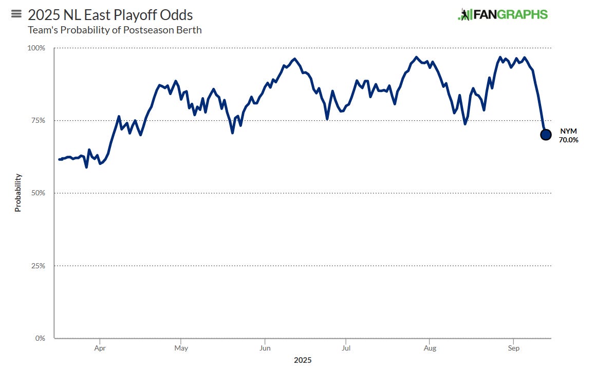 However, per FanGraphs, the Mets’ chances have fallen even further, all the way down to a flat 70%. With the Mets in an absolute free fall in the loss column, the Giants remain a very real, looming threat. Though the Mets own the tiebreaker, they also now sit just one more loss and/or Giants victory away from surrendering their slot outright: