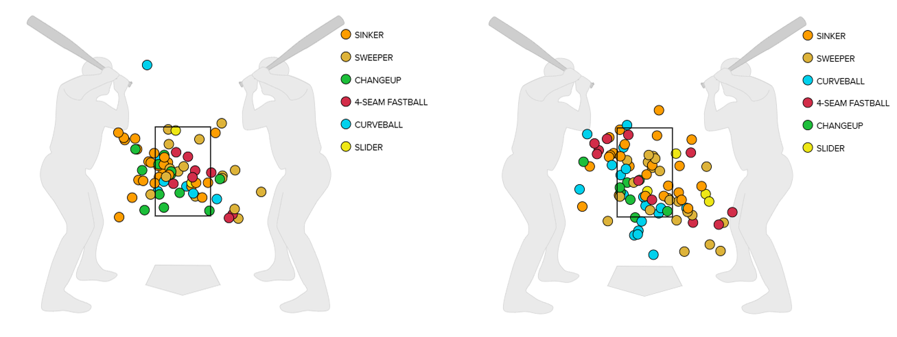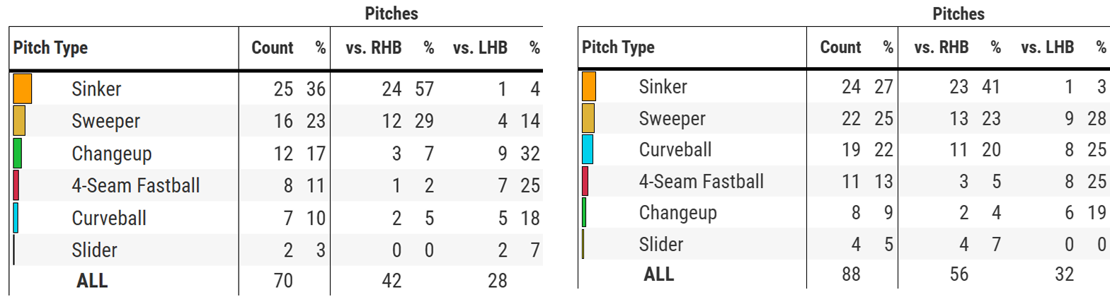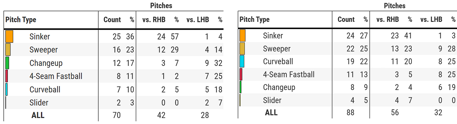 I did notice some interesting shifts in Sproat’s pitch mix compared to that of his debut, though. Take a look:
