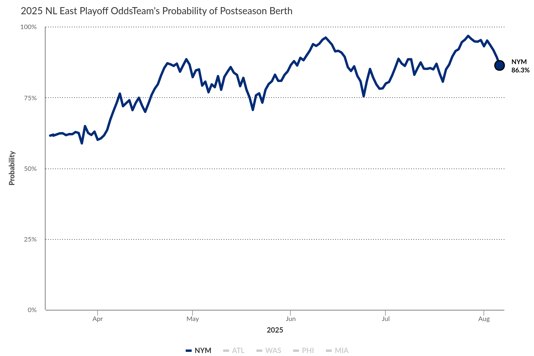 Per FanGraphs, the Mets have an 86.3 percent chance of making the playoffs in 2025: