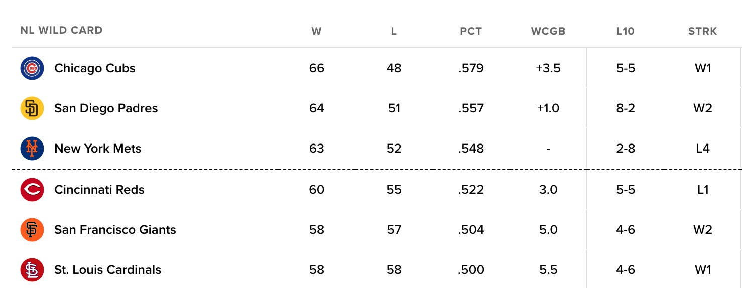 The Mets are now 3.5 games back of the Cubs for the first Wild Card spot, and a game behind the Padres for the second Wild Card berth. They are still three games ahead of the Reds for a playoff spot.