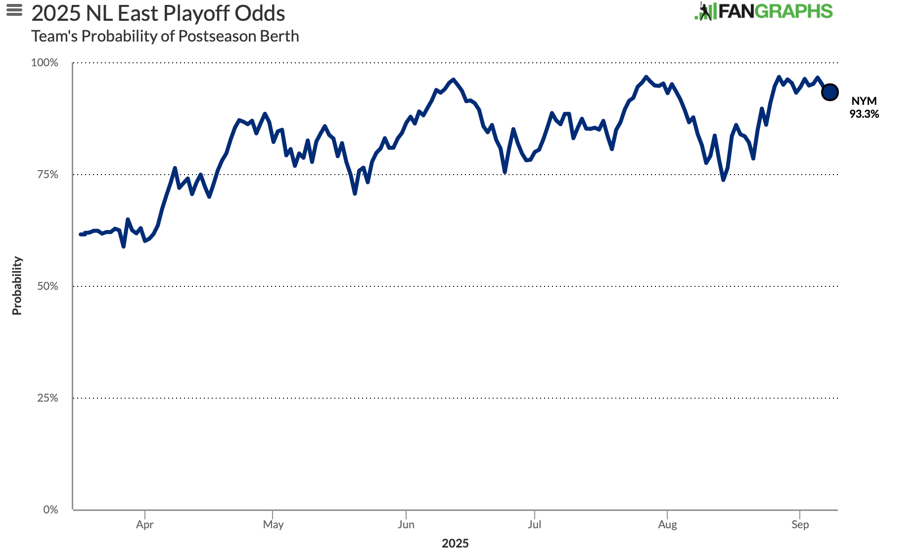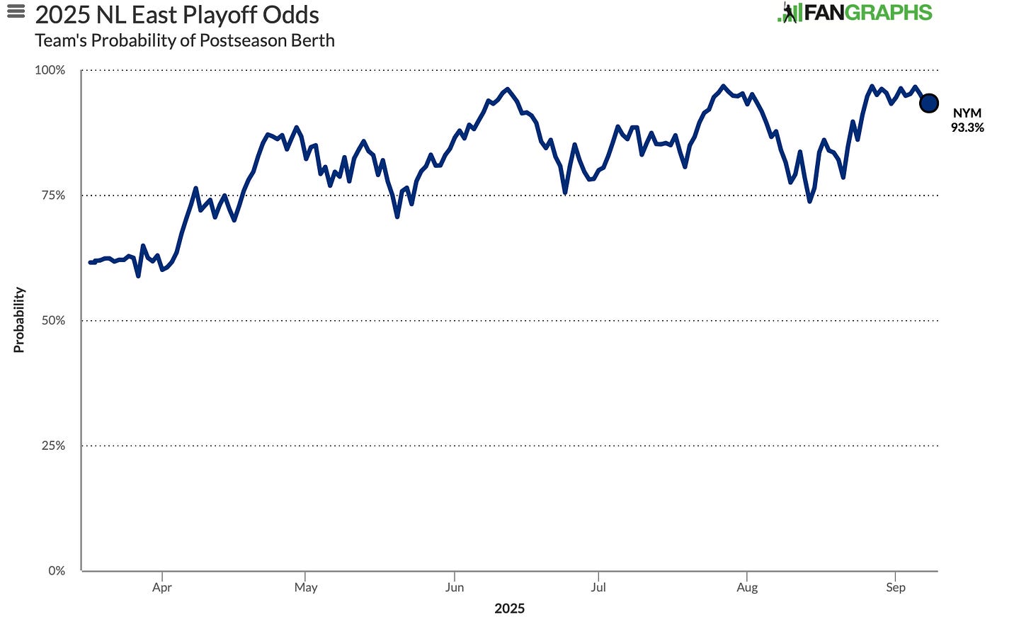 Per Fangraphs, the Mets have a 93.3% chance to reach the postseason.