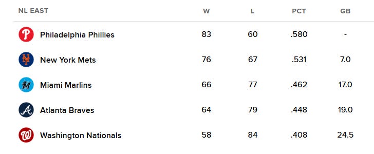 The Phillies lost to the Marlins on Sunday, but with the Mets loss to the Reds it is even more unlikely New York can be a factor in the NL East down the stretch. The two teams begin a four game series in Philadelphia tonight, and the Mets simply have to win all four if they want to mount a Hail Mary division comeback.