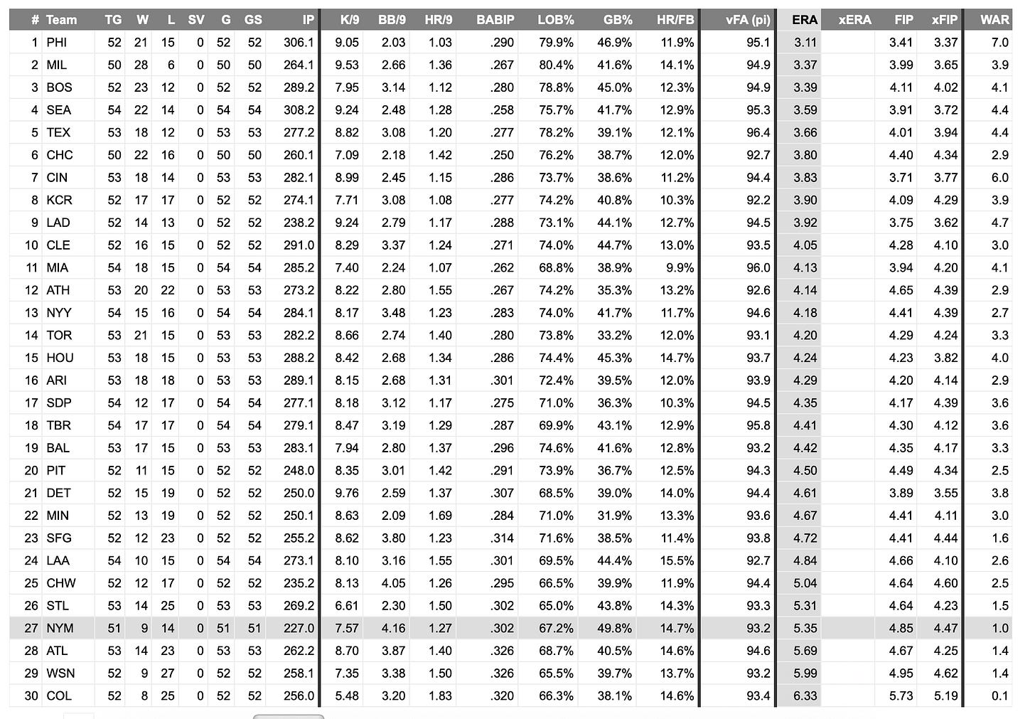 New York has received 594 1/3 innings from its starters this season - that ranks 27th in the majors. Since June 13, the Mets rank dead last in that category