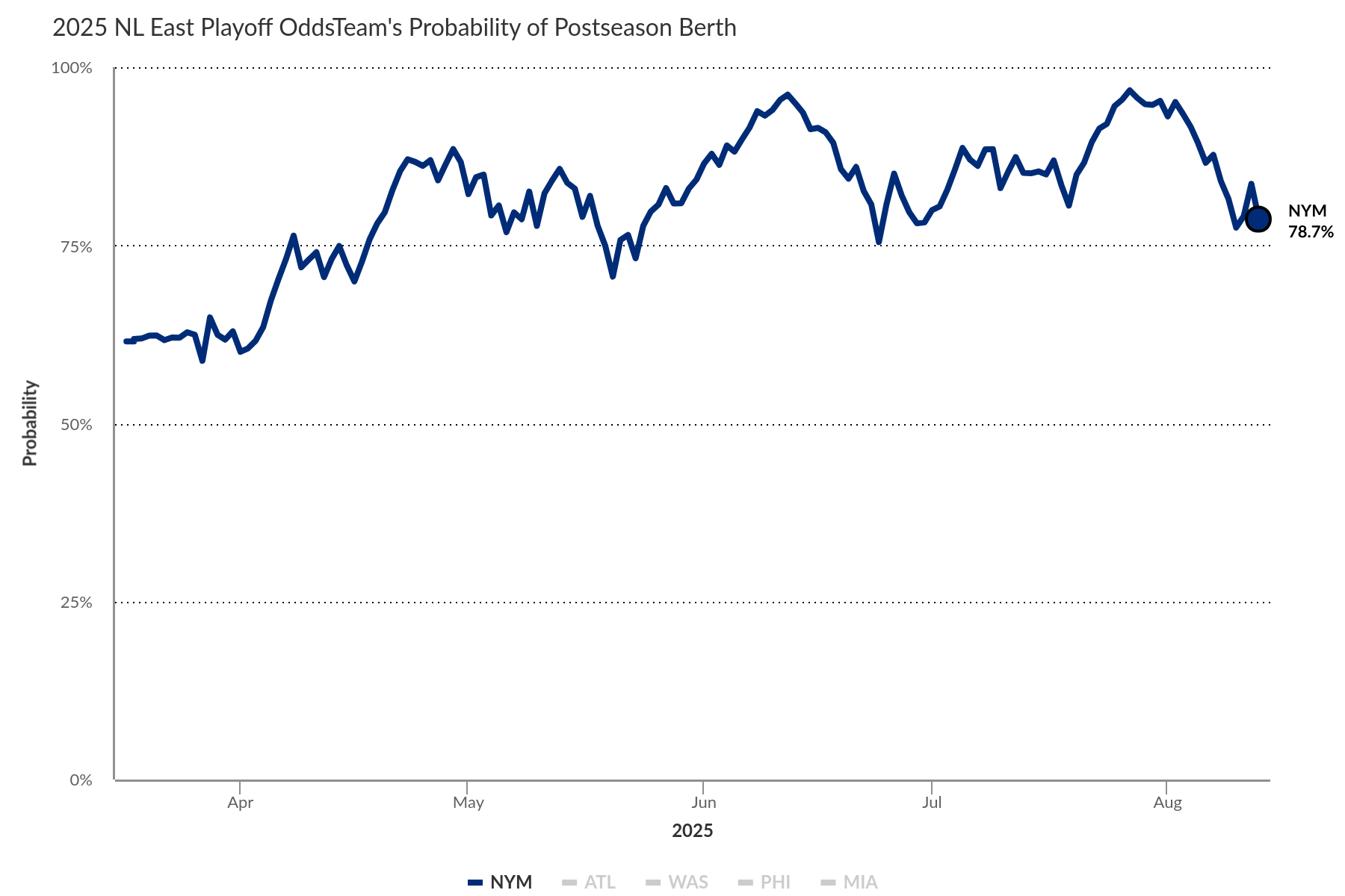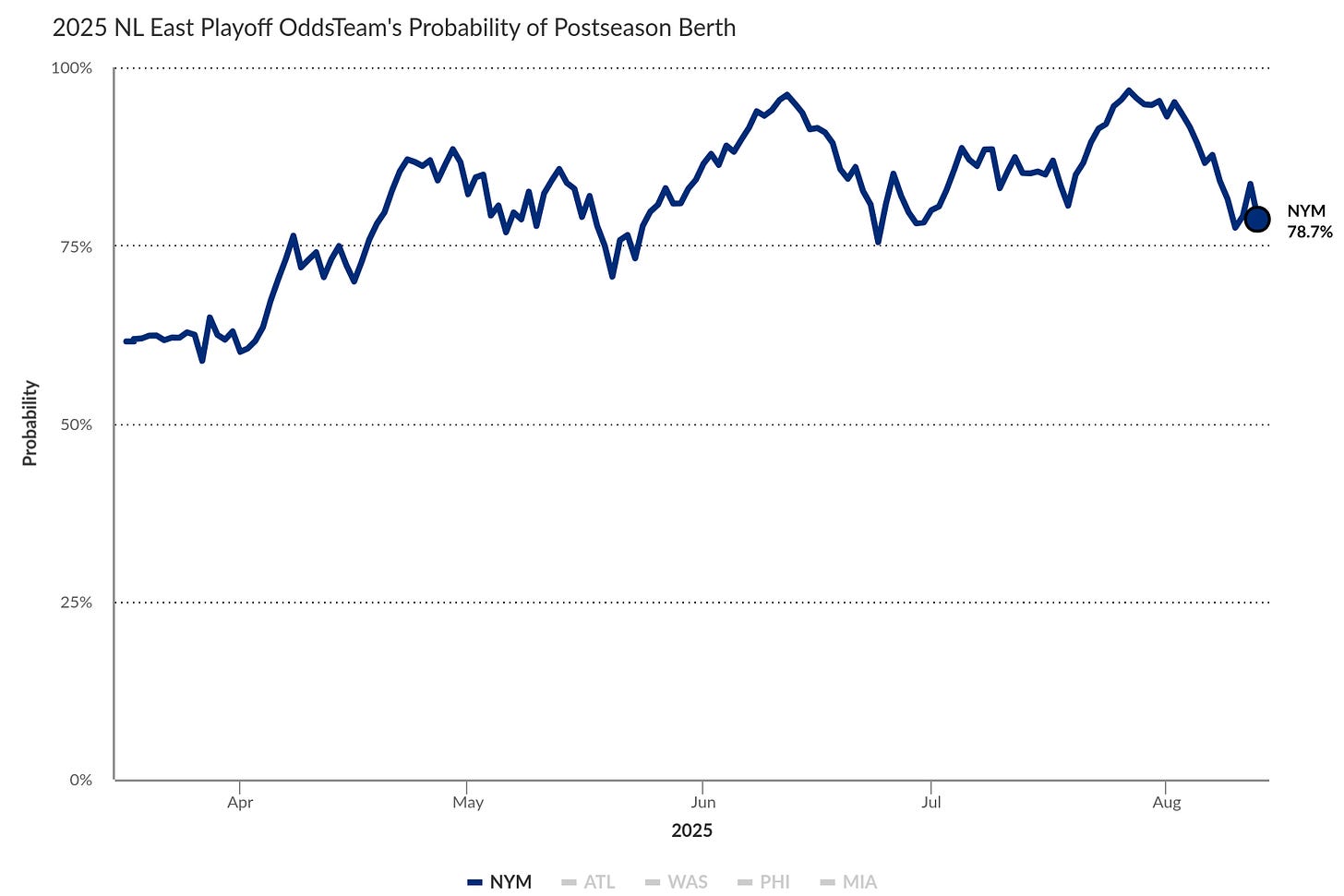 Per FanGraphs, the Mets now have a 78.7% chance of making the 2025 playoffs, down from 82.7% on Wednesday.