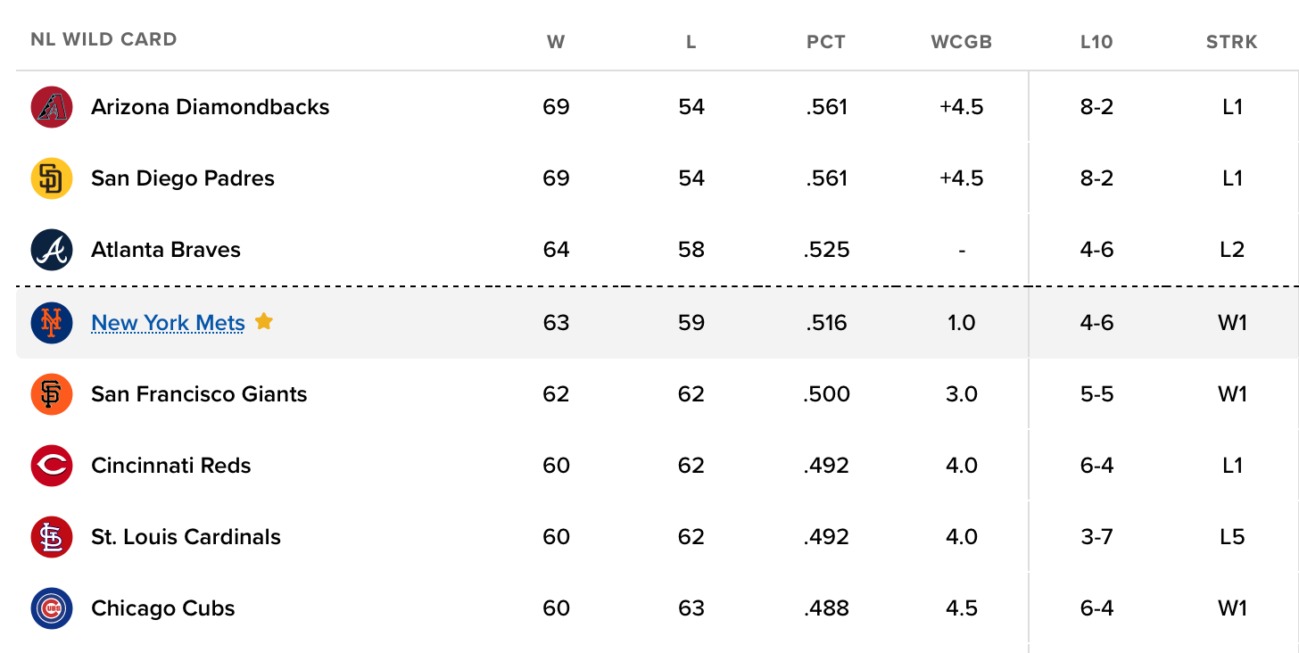 The Mets gained ground on all three of the teams ahead of them in the wild card race on Friday night. They are now 5.5 games behind the Diamondbacks and Padres for the first and second wild card spots, and just a game behind the Braves for the third wild card spot.