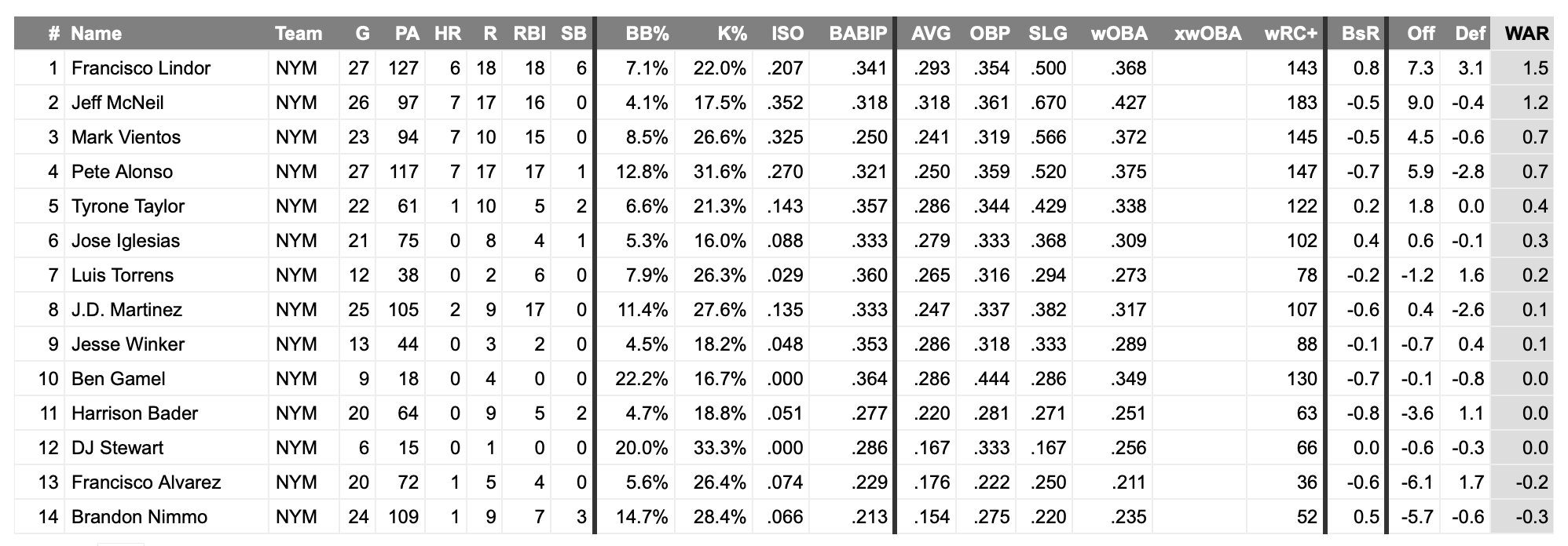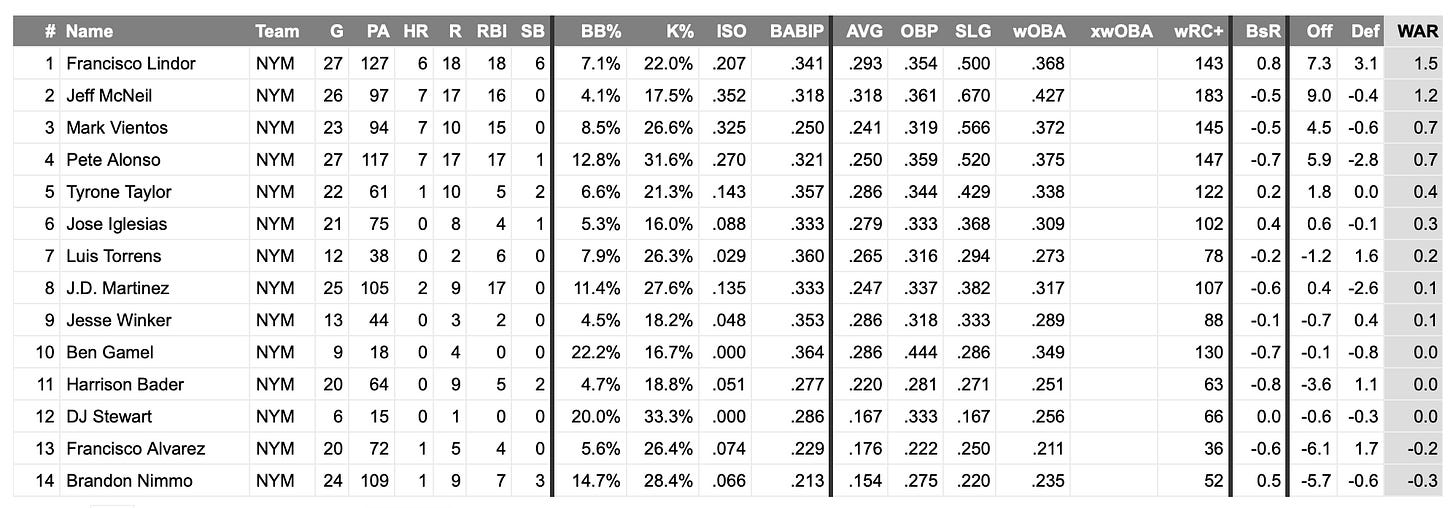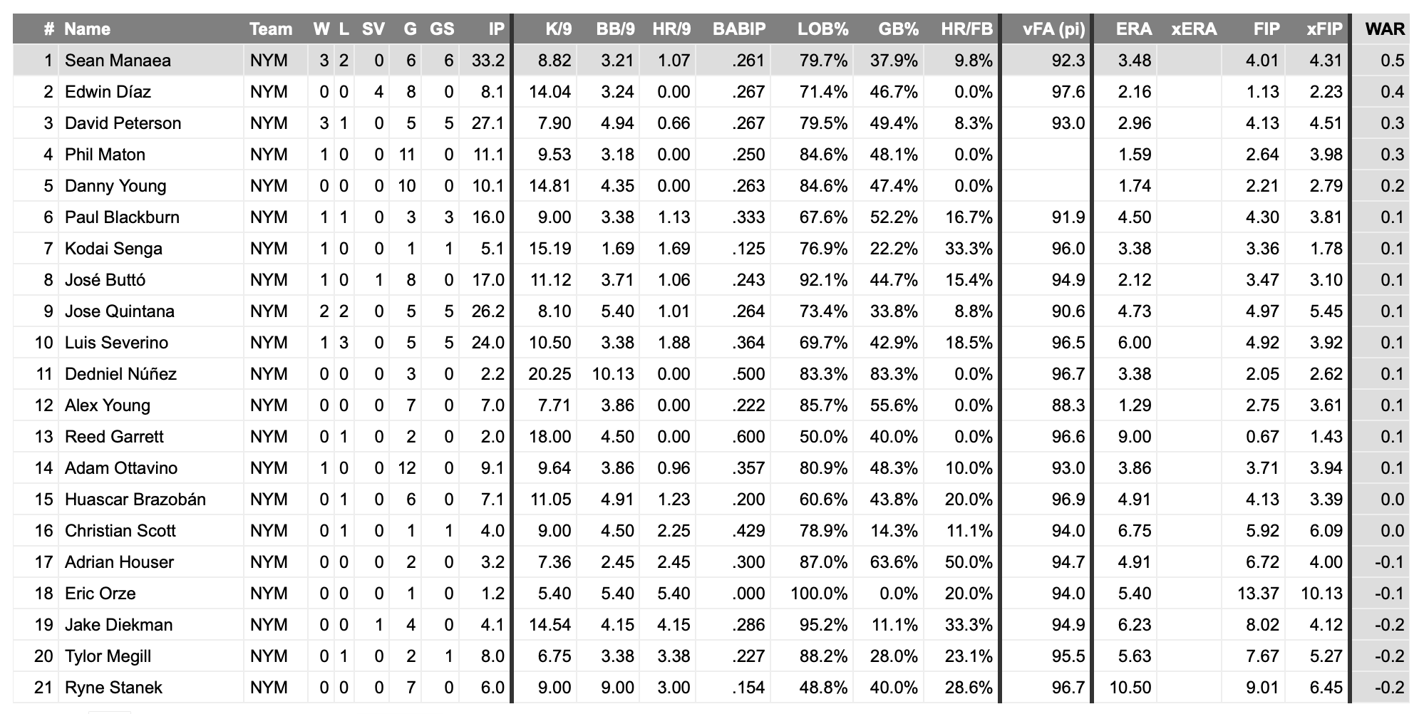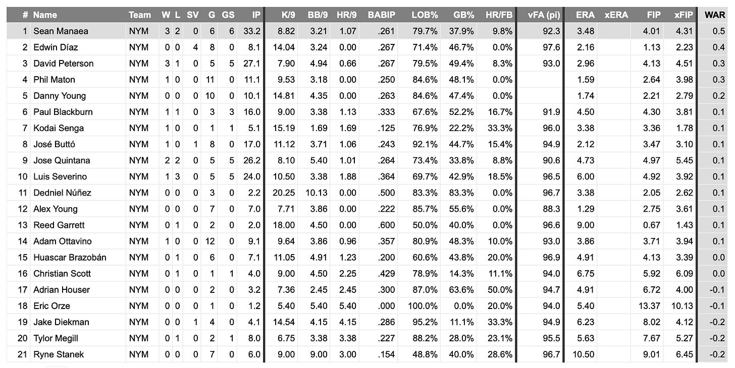Manaea gave the Mets something they’ve been sorely lacking in general, pretty much from day one on Friday: a solid, steady, smooth start. It’s not always pretty with Manaea but he is putting together a strong overall stretch despite his clunker in Seattle last weekend. He has a 2.73 ERA over his last 12 starts and is averaging nearly six innings per start in each and averaging 2.3 walks per game during that span.