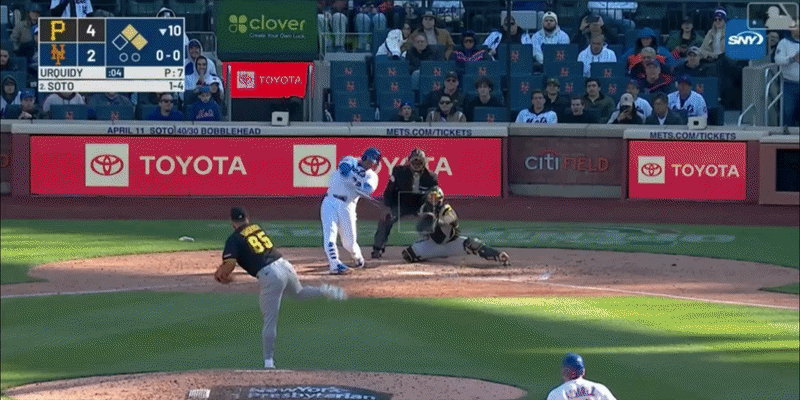 In the bottom of the tenth inning with nobody out and the Mets trailing 4-2, Juan Soto doubled into the left-center field gap to plate Francisco Alvarez, but Francisco Lindor was thrown out at the plate, which more or less ended the Mets threat and their day.