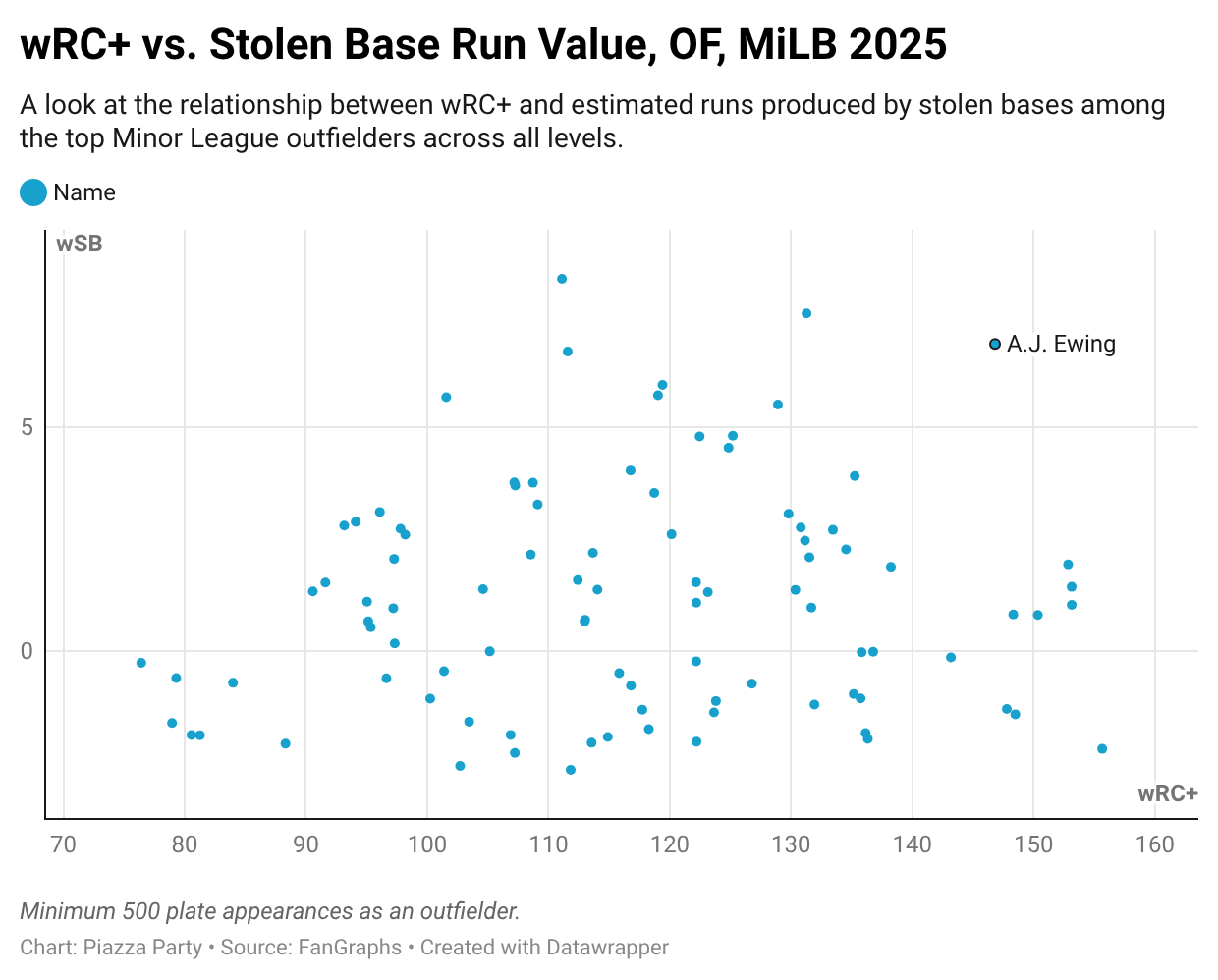 Among MiLB outfielders with at least 500 plate appearances in 2025, no player offered the same combination of run creation value and base stealing value. This chart demonstrates just how good a run creator Ewing is, and how valuable base stealing (and speed in general) is to his formula for success.
