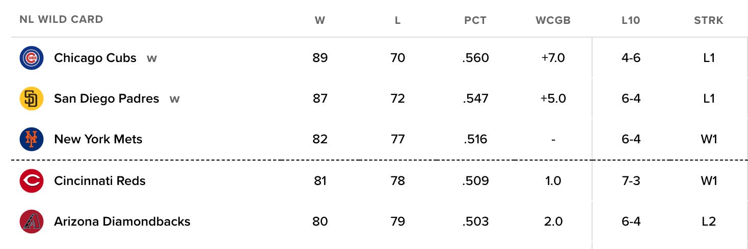 Per Fangraphs, the Mets have a 77.9% chance of making postseason. Meanwhile, the Reds odds are at 20.0% and the Dbacks are down to just a 2.1% of getting in.