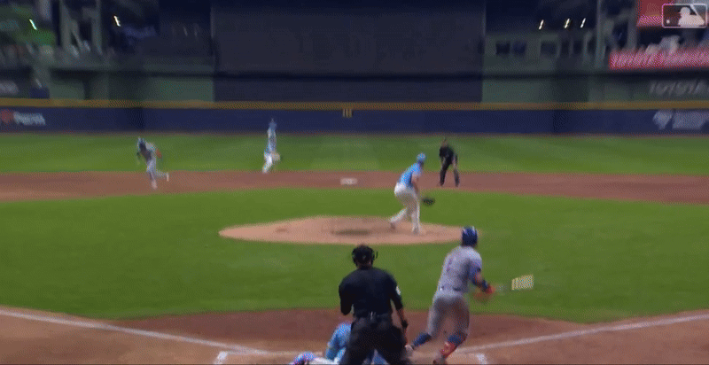 After Starling Marte - who had already homered in the game - hit a two-out double in the ninth, the Mets had the tying run on base when Jeff McNeil hit a bloop single to center. Marte came around to score to tie the game but was thrown out at home thanks to a hell of a dart by Brewers outfielder Blake Perkins. That ended the game right there and then.