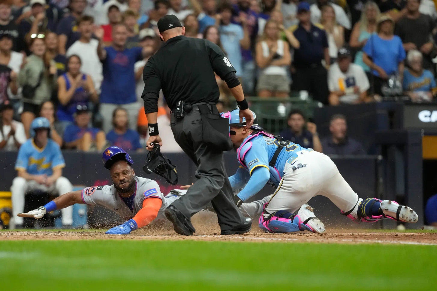 Then, with Milwaukee leading 3-2, the Mets had a golden opportunity to tie the game in the top of the ninth. Marte was on second, representing the tying run, and broke for home after Jeff McNeil hit a bloop single. However, Marte was thrown out at home thanks to a dart from Blake Perkins. It was a tremendous play, but maybe manager Carlos Mendoza made a mistake by not pinch-running for Marte in that situation. I mean, we all know Marte has bad knees and is not the threat on the basepaths he once was. Would swapping Marte with Tyrone Taylor not have been the better move?