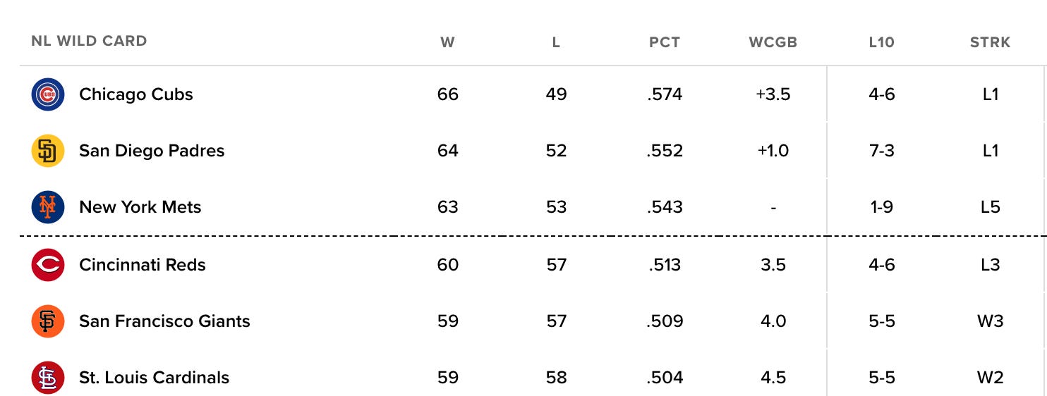 The Mets are still one game behind the Padres for the second Wild Card spot, and 3.5 games ahead of the Reds for the final Wild Card berth in the NL.