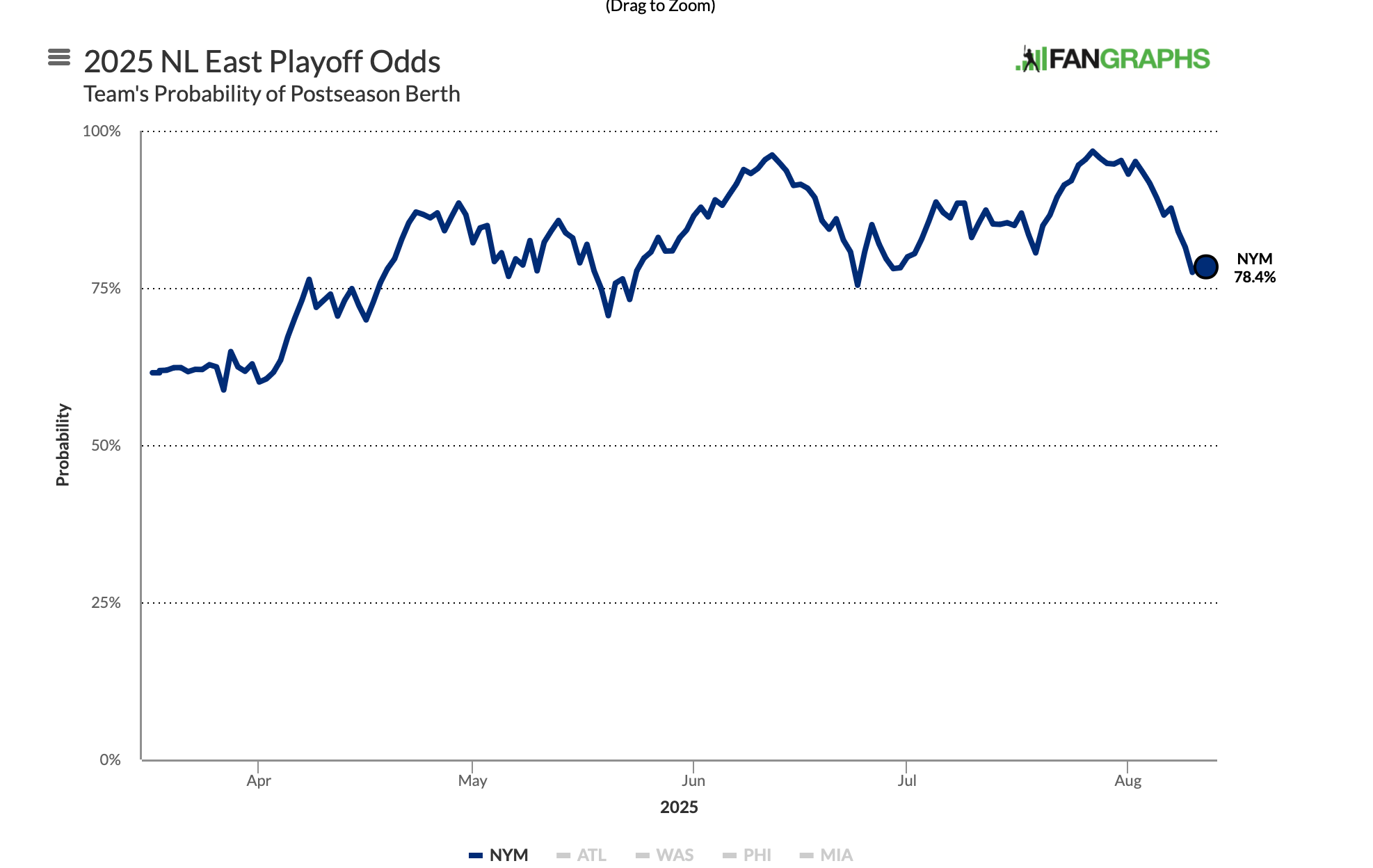 Per FanGraphs, the Mets now have an 78.4% chance of making the playoffs in 2025: