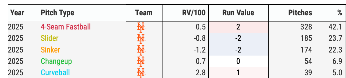The amazing part about Megill’s situation is that he has elite movement on all of his pitches. The problem I see is his slider and sinker have been less effective and arguably sub-big league in quality, yet he throws those pitches the majority of the time. I am not a pitching coach, but perhaps it’s time to adjust the usage of those pitches, use them less and rely a little more on his fastball and curve, two pitches which at least have positive run values? Also - the three pitches he uses the most (fastball, slider, sinker) are all similar speed. To me, he should incorporate his change-up more if only as a “show me” pitch and create some imbalance in the strike zone.
