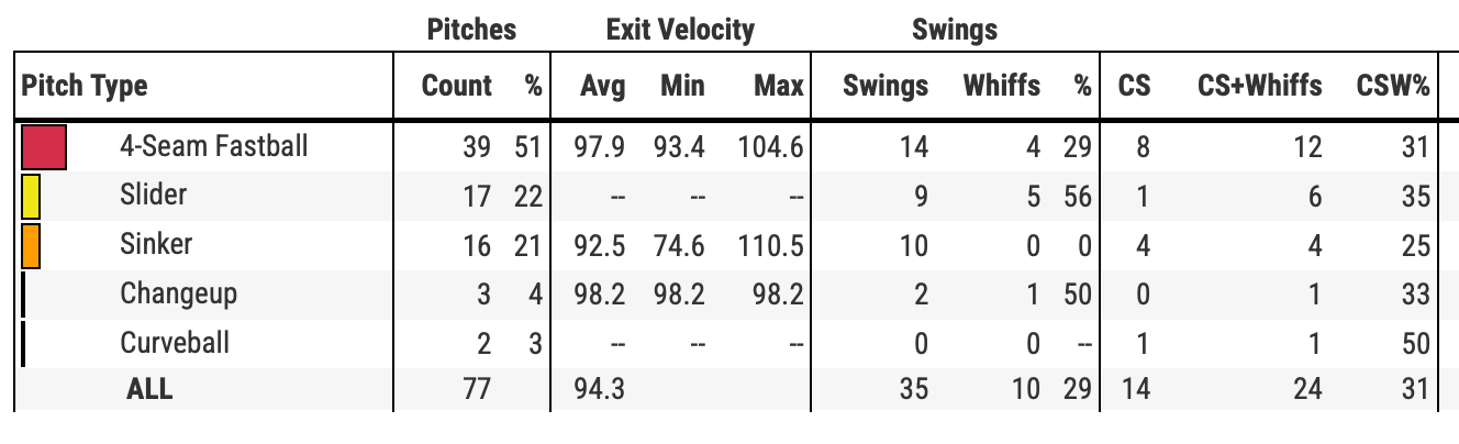 Megill threw a strike on the first pitch to 11 of the 19 batters he faced, while finishing with a total of 49 strikes on 77 pitches. He relied on his fastball, sinker, and slider, but found the most success with his nasty slider.