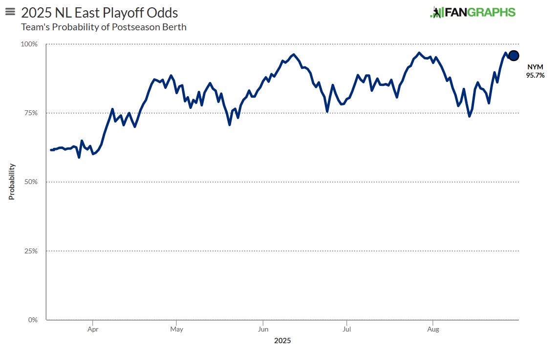 Per FanGraphs, the Mets’ 2025 playoff odds have dipped slightly to 95.7%: