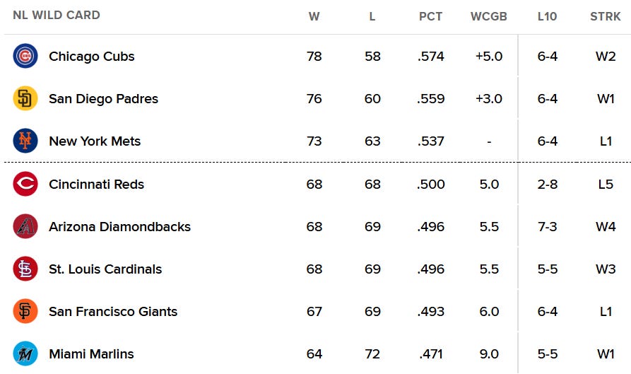 The Reds, on the other hand, lost again to St. Louis, helping the Mets maintain their five-game lead for the final Wild Card spot. The Padres crushed the Twins, though, widening their gap over the Mets back to three games.