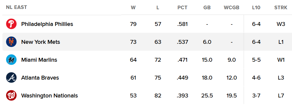 The Phillies beat the Braves yesterday, leaving the Mets six games back of the NL East lead: