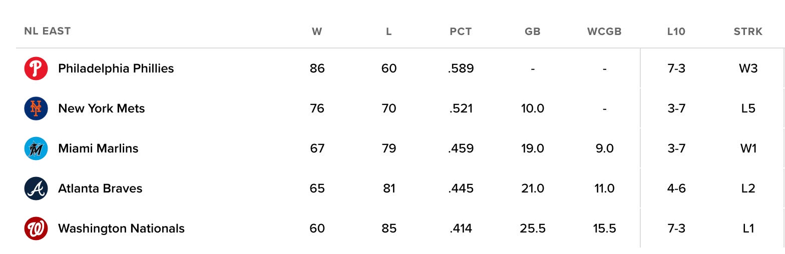 Having dropped three straight to the Phillies, any hopes of getting back into the NL East race are all but over. The Mets now sit a full 10 games behind the Phillies with 16 left to play.