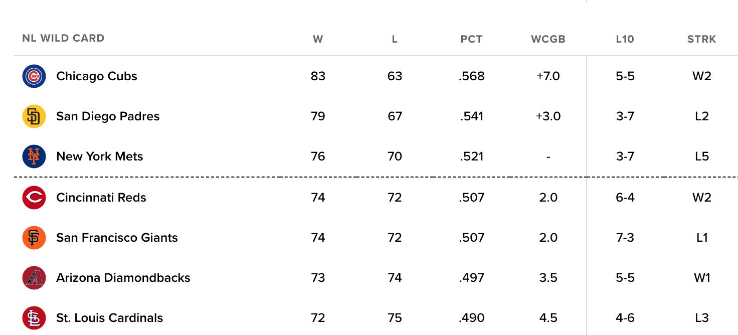 While the Giants also lost on Wednesday, the Reds beat the Padres, meaning that the Mets hold just a two-game lead over both Cincinnati and San Francisco for the final Wild Card spot in the National League. Furthermore, following their win over the Giants, the Diamondbacks are only 3.5 games back, adding another layer of intrigue to the race for that final Wild Card berth.